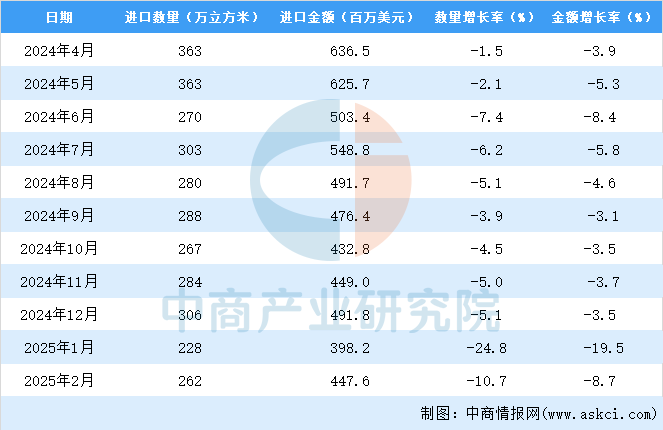 从金额方面来看,2025年1-2月中国原木进口金额845。9百万美元。