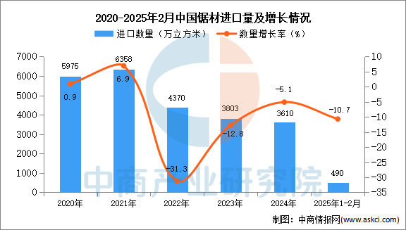 中商谍报网讯:据中商财产研究院数据库显示,2024年中国原木进口量3610万立方米,同比下降5。1%。最新数据显示,2025年1-2月中国原木进口量490万立方米。