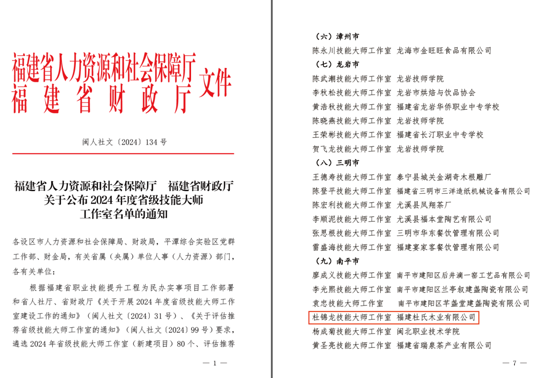 本网讯 近日,福建省人力资本和社会保障厅、福建省财务厅发布了2024年度省级技术大师工做室名单,由邵武市保举申报的福建杜氏木业无限公司杜锦龙技术大师工做室榜上出名,成为邵武市建成的第一家非公企业省级技术大师工做室。
